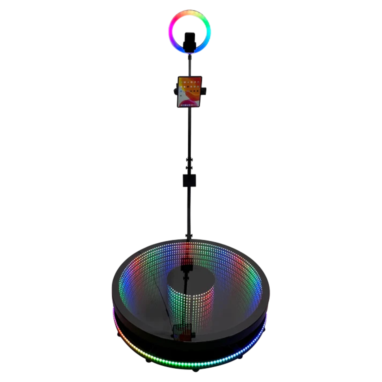 Our 360° video booth features a four-foot diameter platform with a strong glass base, providing ample space for individuals to move freely or for up to five people to join in as the camera rotates around them. With customizable LED lights, the booth can seamlessly match your event’s color scheme or create a vibrant light show to draw in more guests.
